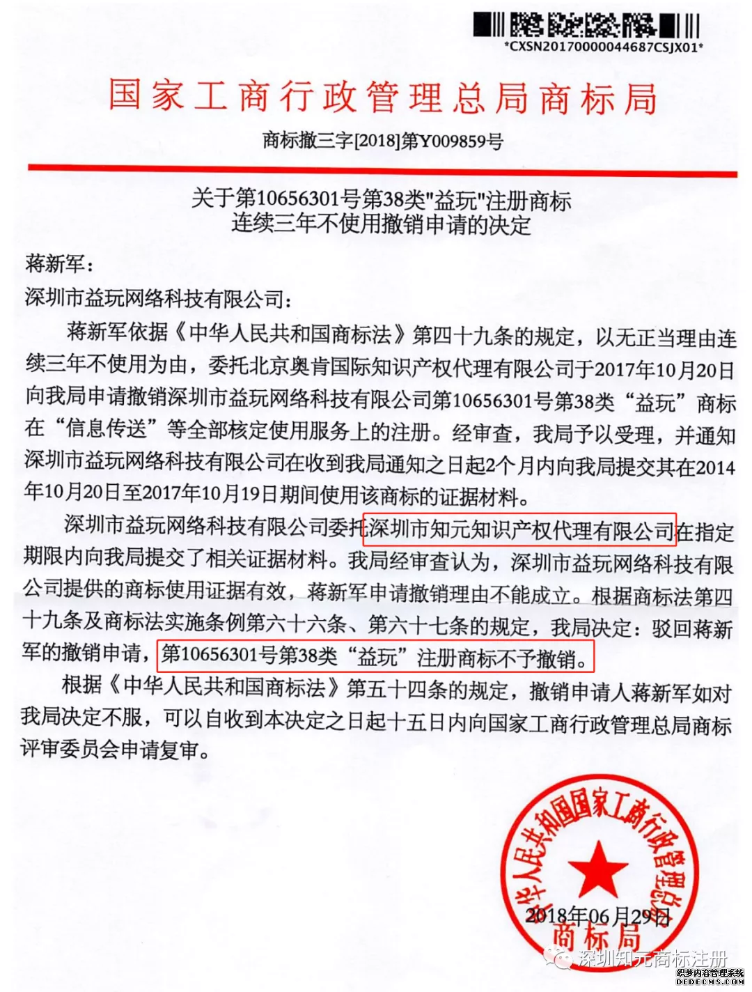 商标局最终决定驳回申请人的撤销申请,第10656301号第38类“益玩”注册商标不予撤销。